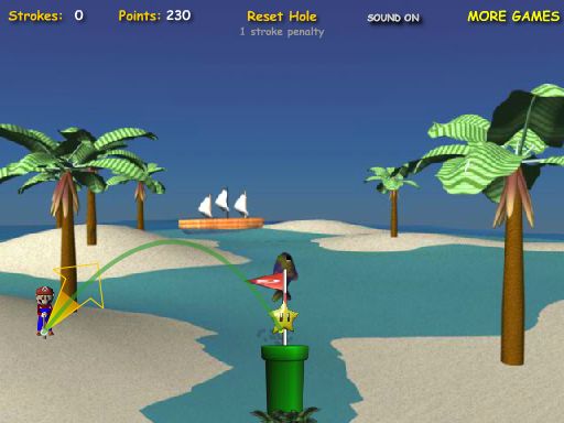 Простенькая в управлении игра с неплохим дизайном и хорошей музыкой. Действие игры происходит на берегу моря, на пляже, тут очень много морских обитателей, которые иногда могут встретиться на пути у мяча Марио и изменить его путь. Не стоит пугаться сложности второго уровня, после него дело пойдет веселее и забивать мячики в лунки станет легче, как это не странно. В этом гольфе необычайно простое управление, тут видно примерную траекторию полета мяча и очень хорошо визуализируется и настраивается сила удара по мячику.